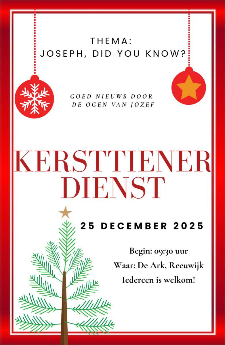 Kersttiener Dienst Thema: Joseph, did you know? Goed nieuws door de ogen van Jozef. 25 December 2025; 09:30 Iedereen is welkom!
